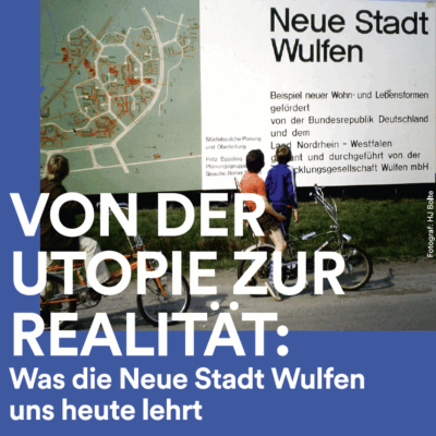 Der BDA Recklinghausen Vest widmet sich am 12.03.2026 städtebaulichen und architektonischen Utopien am Beispiel der „Neuen Stadt Wulfen“. Um 17.00 Uhr startet das Programm und neben einer Ausstellung zur Entwicklung der Neuen Stadt Wulfen sowie einem geführten Rundgang durch das heutige Dorsten-Barkenberg hält Yasemin Utku einen Vortrag über die Ideengeschichte der Neuen Stadt Wulfen und was wir daraus für heutige große Siedlungsvorhaben lernen können.